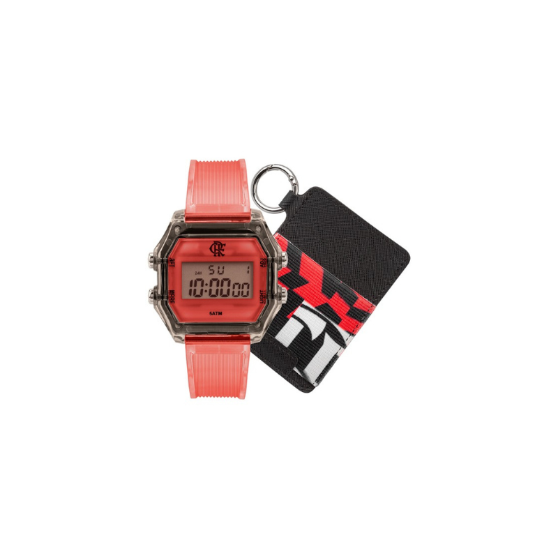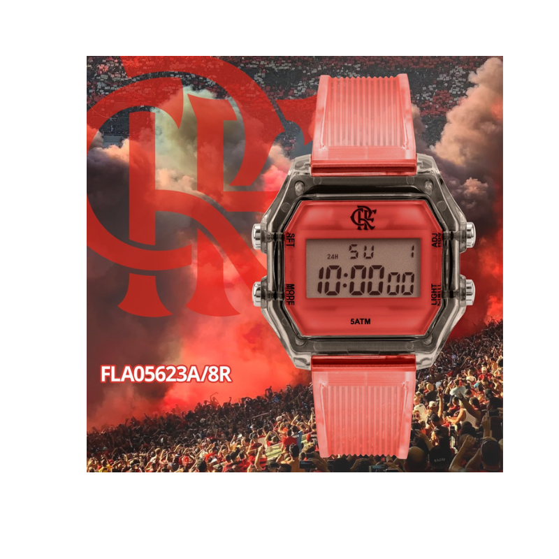 Relógio masculino do Flamengo, apresenta maquinismo digital e pulseira de silicone na cor vermelha. O relógio conta com mostrador de LCD positivo e caixa retangular com detalhes na cor preto. Resistente à água de 50 metros e vem acompanhado de uma carteira especial.