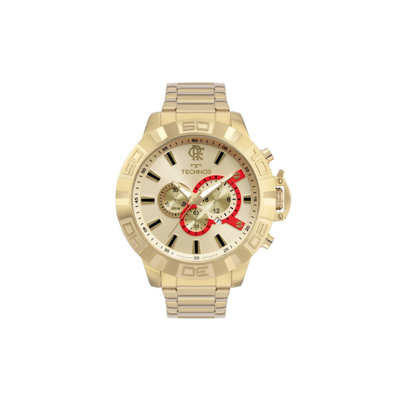 Relógio masculino do Flamengo, com maquinismo analógico e tipo de fundo rosqueado, e pulseira de aço 100% inoxidável com banho em dourado. Apresenta mostrador na cor champanhe e marcadores de horas em indexes nas cores dourado e preto, além de apresentar aro interno corrugado e detalhes em vermelho. O relógio conta com escudo CRF na cor dourado na posição de 12 horas e resistência à água de 100 metros e vem acompanhado de uma chaveiro especial prata.